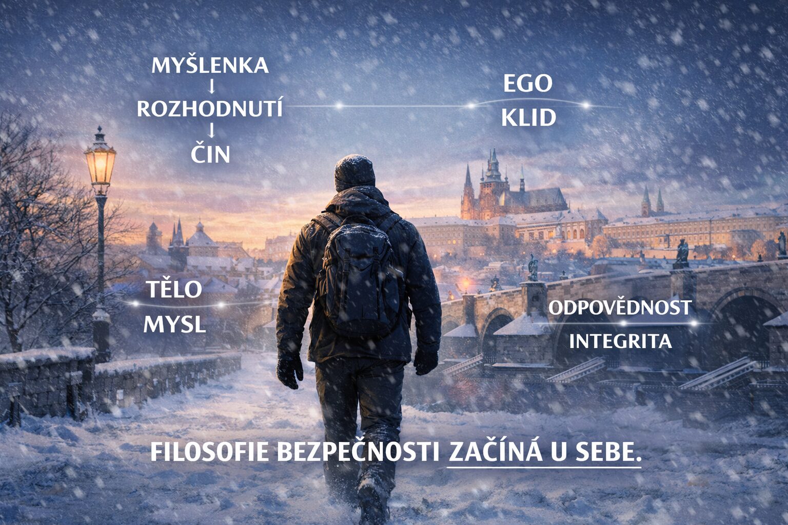 Filozofie bezpečnosti nestojí na velkých slovech. Stojí na návyku. Myšlenka – rozhodnutí – čin. Pokud mezi nimi vznikne dlouhá prodleva, vstupuje do prostoru pochybnost, vyjednávání a pohodlí. Tentokrát prodleva nebyla. Ráno bylo minus šest, čerstvě napadaný sníh tlumil kroky a město ještě nebylo plně probuzené. Podmínky byly ideální, a hlavně byly skutečné. Bezpečnost se vždy rodí z práce s realitou, nikoli z čekání na komfort.